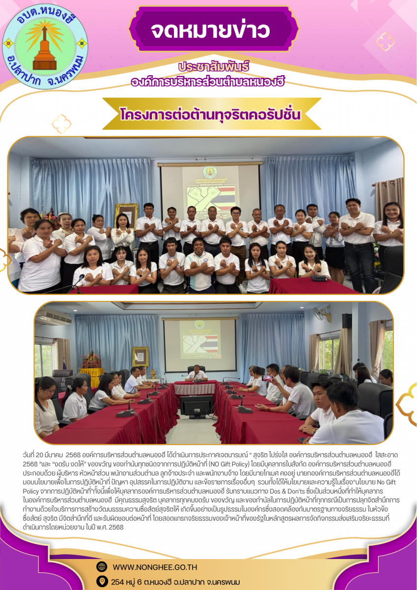 • กิจกรรมส่งเสริมจริยธรรมองค์การบริหารส่วนตำบลหนองฮี ประจำปีงบประมาณ พ.ศ. 2568