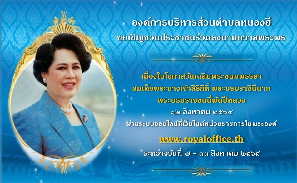 องค์การบริหารส่วนตำบลหนองฮี ขอเชิญชวนประชาชนร่วมลงนามถวายพระพร สมเด็จพระนางเจ้าสิริกิติ์ พระบรมราชินีนาถ พระบรมราชชนนีพันปีหลวง เนื่องในโอกาสวันเฉลิมพระชนมพรรษา วันที่ 12 สิงหาคม 2564 ผ่านระบบออนไลน์ ที่เว็บไซต์หน่วยราชการในพระองค์ www.royaloffice.th ระหว่างวันที่ 7 – 13 สิงหาคม 2564