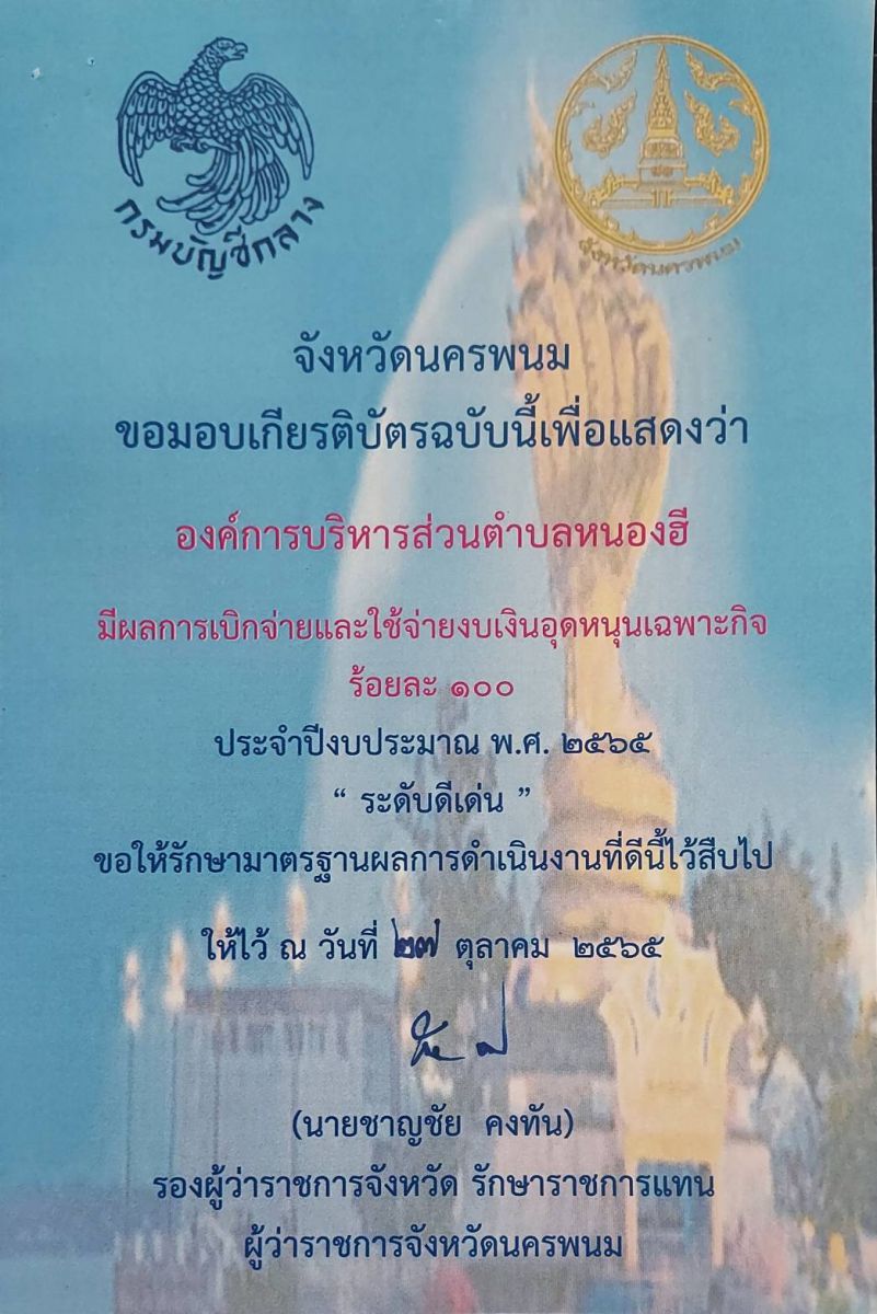 จังหวัดนครพนม มอบเกียรติบัตรหน่วยงานที่มีผลการเบิกจ่ายและใช้จ่ายงบประมาณรายจ่ายลงทุนดีเด่น ประจำปีงบประมาณ พ.ศ. 2565 เพื่อเป็นการยกย่องชมเชยและเป็นขวัญกำลังในการปฎิบัติงาน โดยนำข้อมูลจากระบบ New GFMIS Thai ณ วันที่ 31 สิงหาคม 2565 ปรากฎว่าองค์การบริหารส่วนตำบลหนองฮีได้รับเกียรติบัตร "ระดับดีเด่น"