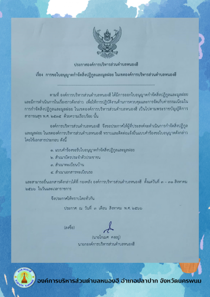 ประกาศองค์การบริหารส่วนตำบลหนองฮี เรื่อง การขอใบอนุญาตกำจัดสิ่งปฏิกูลและมูลฝอย ในเขตองค์การบริหารส่วนตำบลหนองฮี