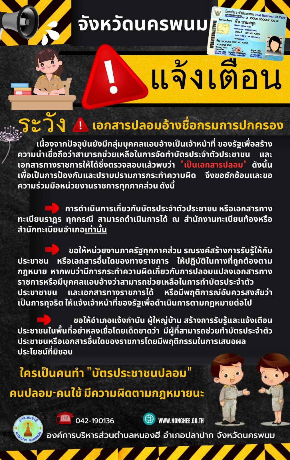 ประชาสัมพันธ์ เรื่อง มิจฉาชีพแอบอ้างชื่อปลัดกระทรวงมหาดไทยทำบัตรประจำตัวประชาชน