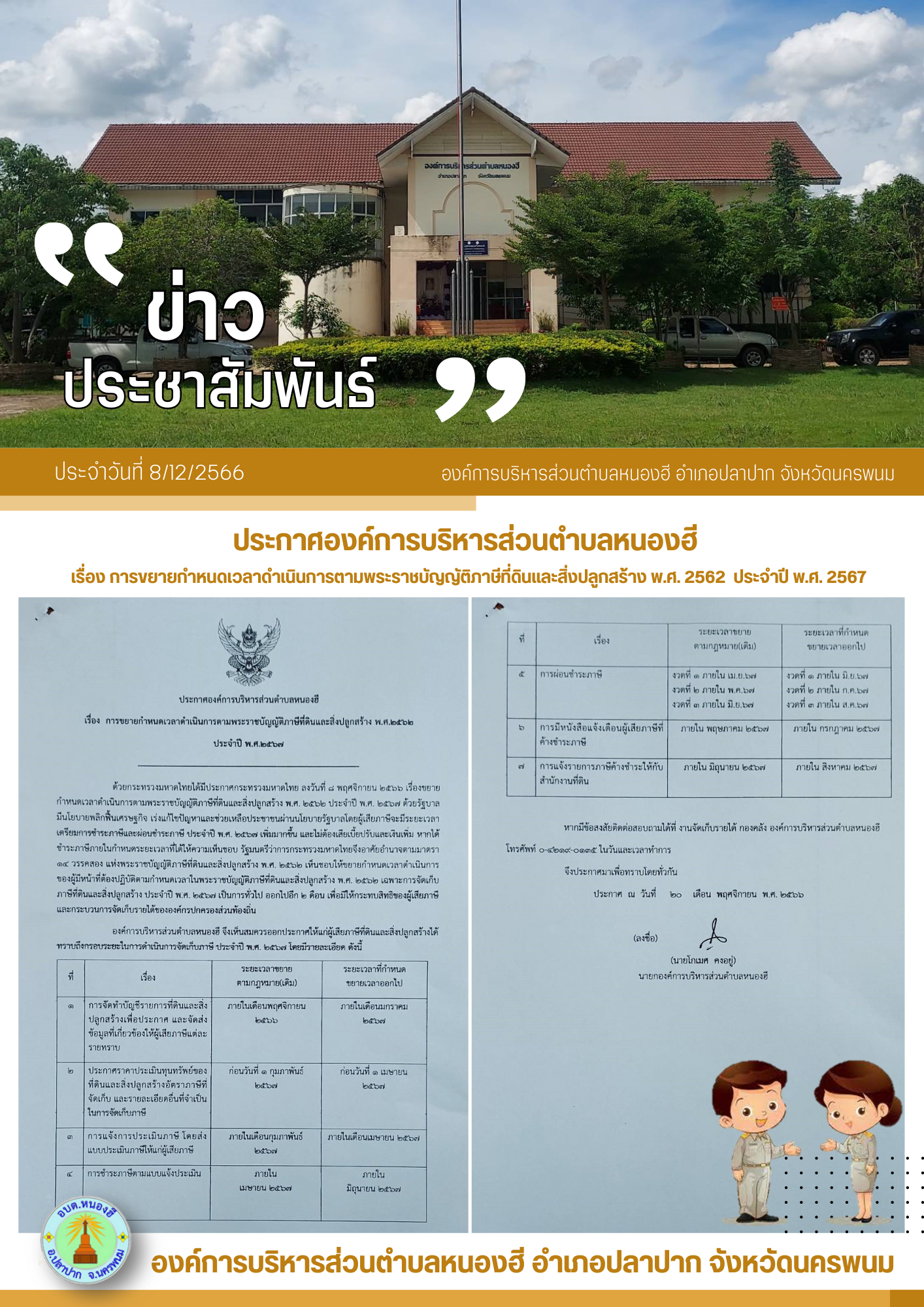 ประกาศองค์การบริหารส่วนตำบลหนองฮี เรื่อง การขยายกำหนดเวลาดำเนินการตามพระราชบัญญัติภาษีที่ดินและสิ่งปลูกสร้าง พ.ศ. 2562 ประจำปี พ.ศ. 2567
