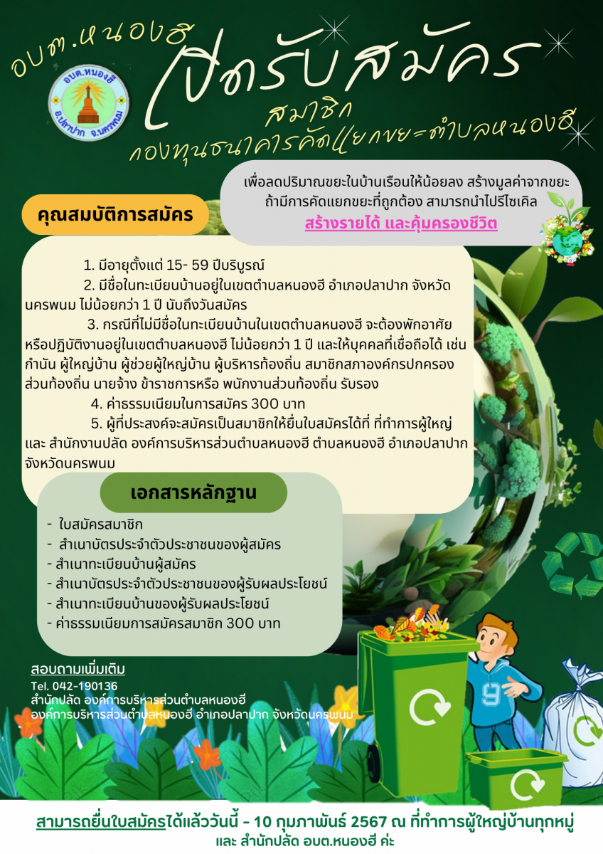 เปิดรับสมัครสมาชิกกองทุนธนาคารคัดแยกขยะตำบลหนองฮี