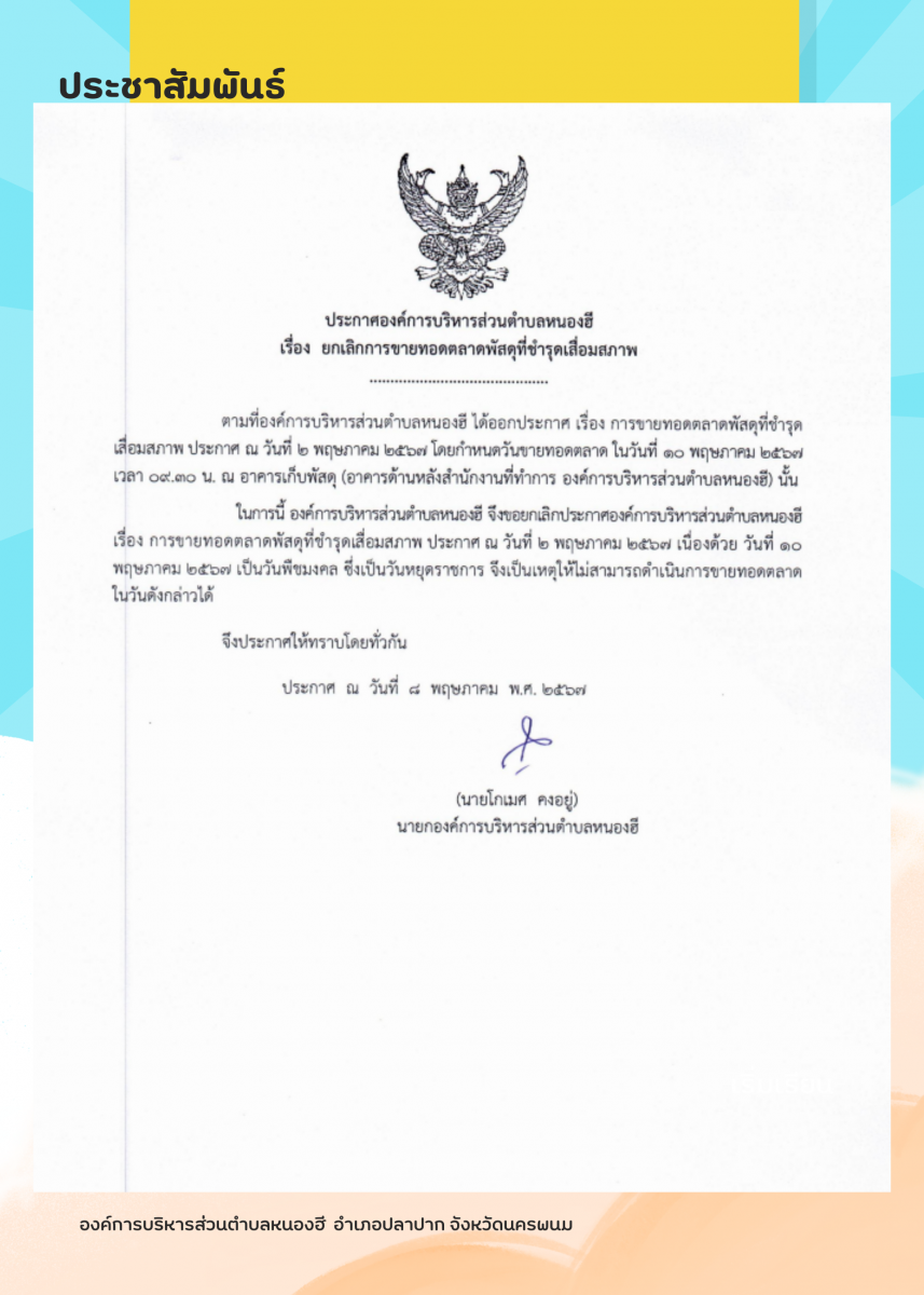 ประกาศองค์การบริหารส่วนตำบลหนองฮี เรื่อง ยกเลิกการขายทอดตลาดพัสดุที่ชำรุดเสื่อมสภาพ