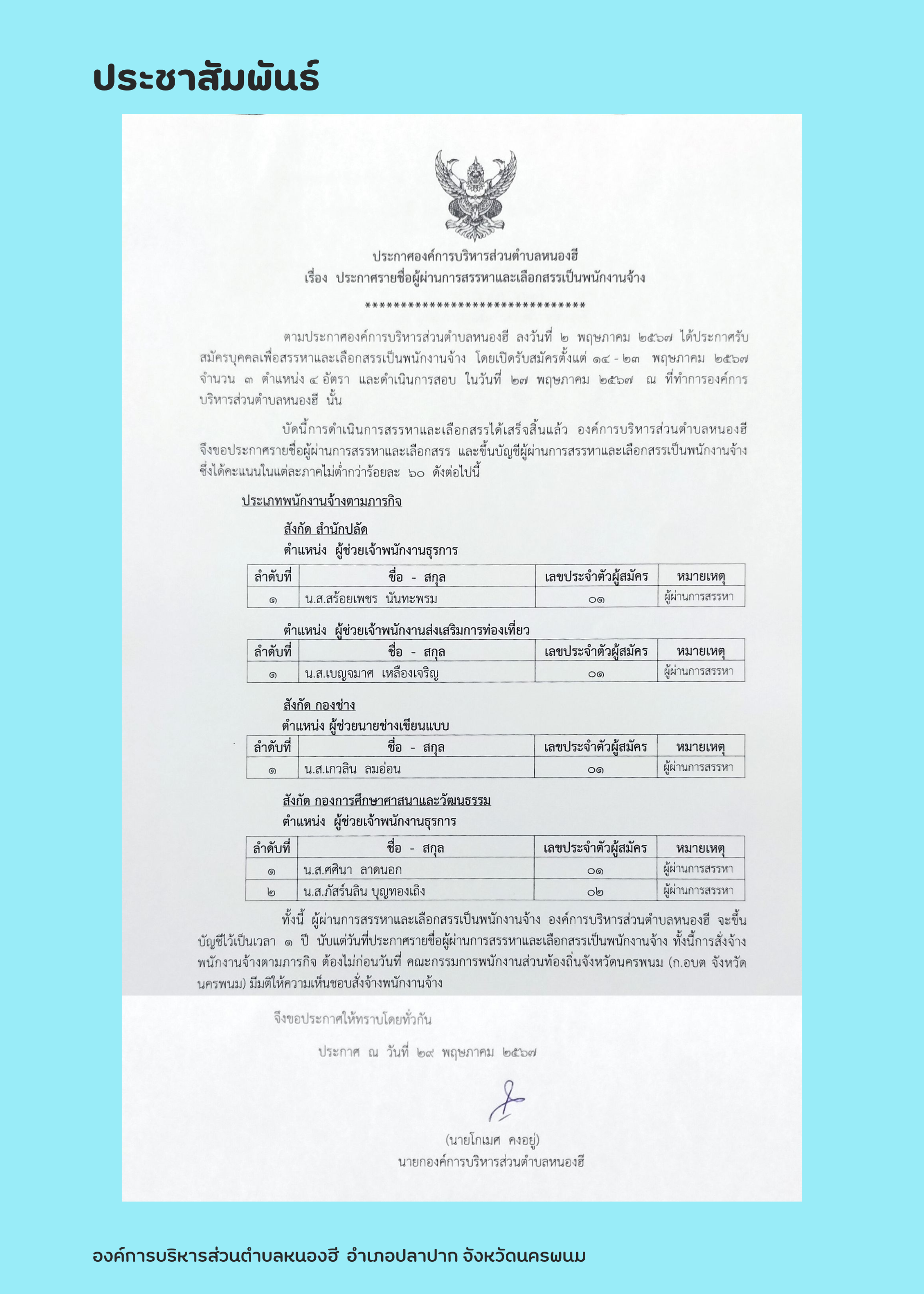 ประกาศองค์การบริหารส่วนตำบลหนองฮี เรื่อง ประกาศรายชื่อผู้ผ่านการสรรหาและเลือกสรรเป็นพนักงานจ้าง