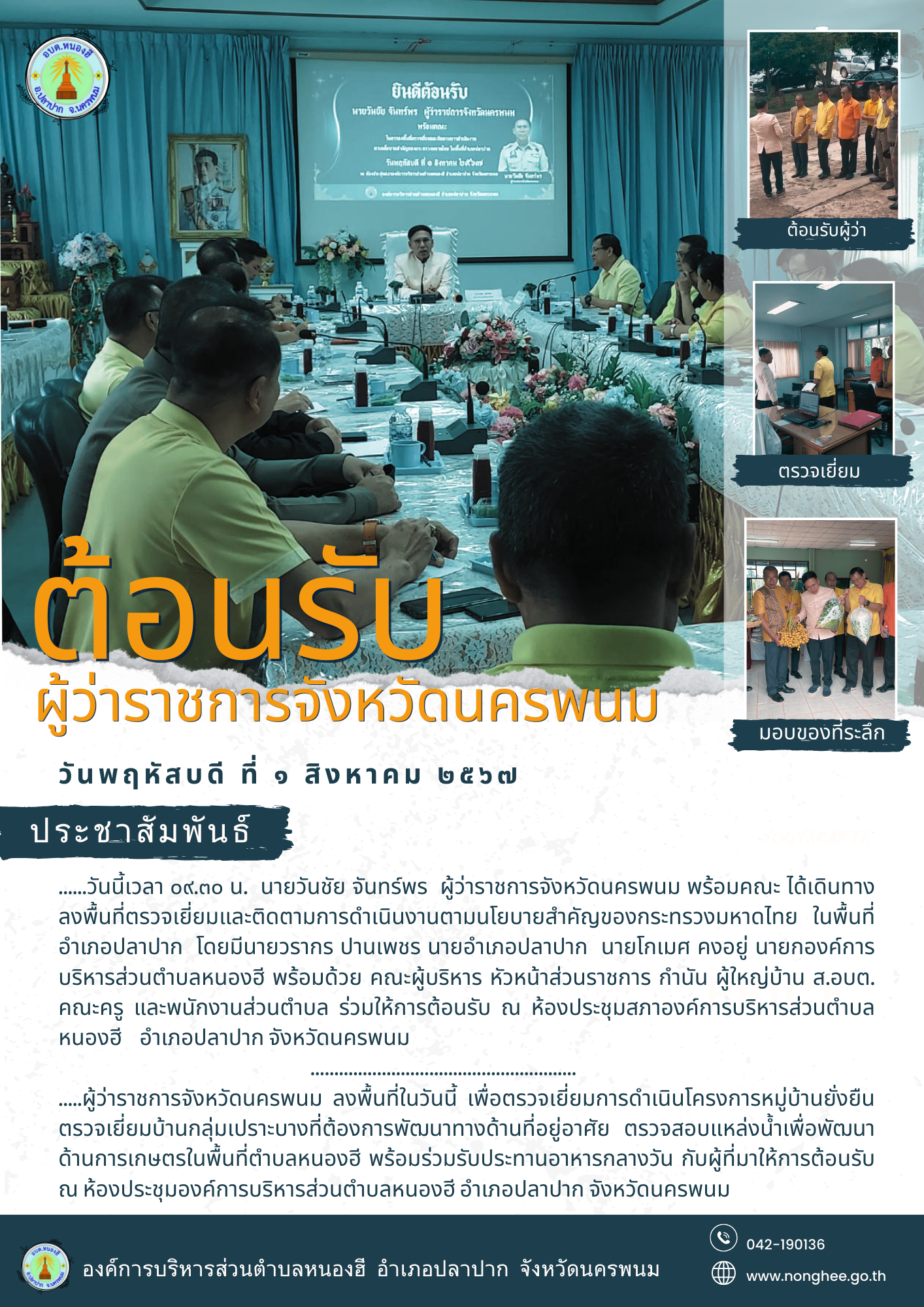 .....ผู้ว่าราชการจังหวัดนครพนม ลงพื้นที่ในวันนี้ เพื่อตรวจเยี่ยมการดำเนินโครงการหมู่บ้านยั่งยืน ตรวจเยี่ยมบ้านกลุ่มเปราะบางที่ต้องการพัฒนาทางด้านที่อยู่อาศัย ตรวจสอบแหล่งน้ำเพื่อพัฒนาด้านการเกษตรในพื้นที่ตำบลหนองฮี พร้อมร่วมรับประทานอาหารกลางวัน กับผู้ที่มาให้การต้อนรับ ณ ห้องประชุมองค์การบริหารส่วนตำบลหนองฮี อำเภอปลาปาก จังหวัดนครพนม