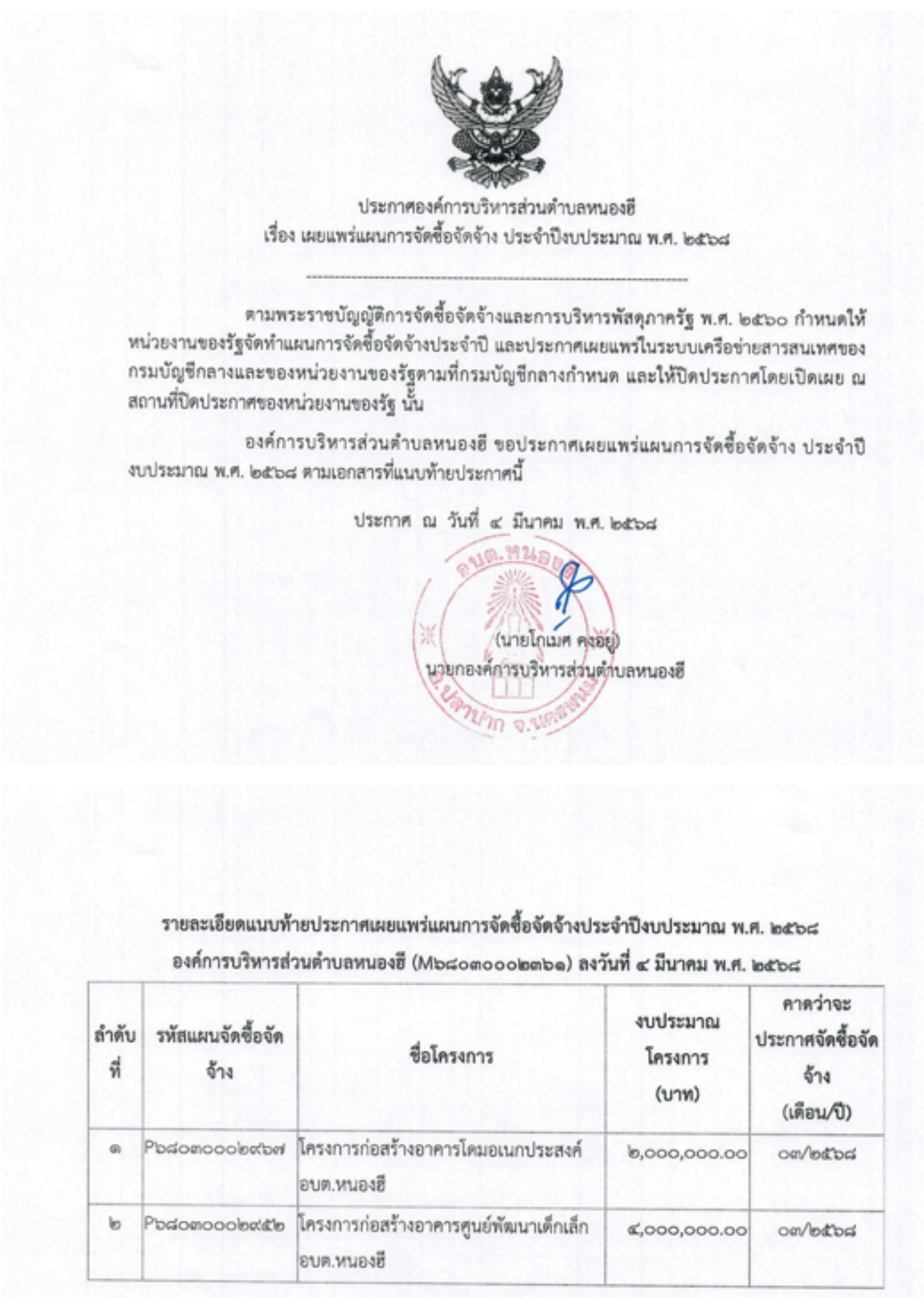 เผยแพร่การจัดซื้อจัดจ้าง ประจำปีงบประมาณ พ.ศ. 2568