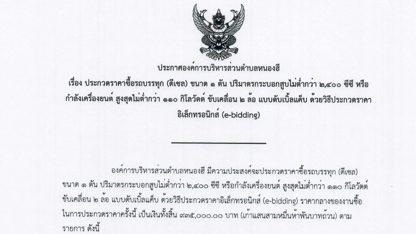 ประกาศองค์การบริหารส่วนตำบลหนองฮี เรื่องประกวดราคาซื้อรถบรรทุก
