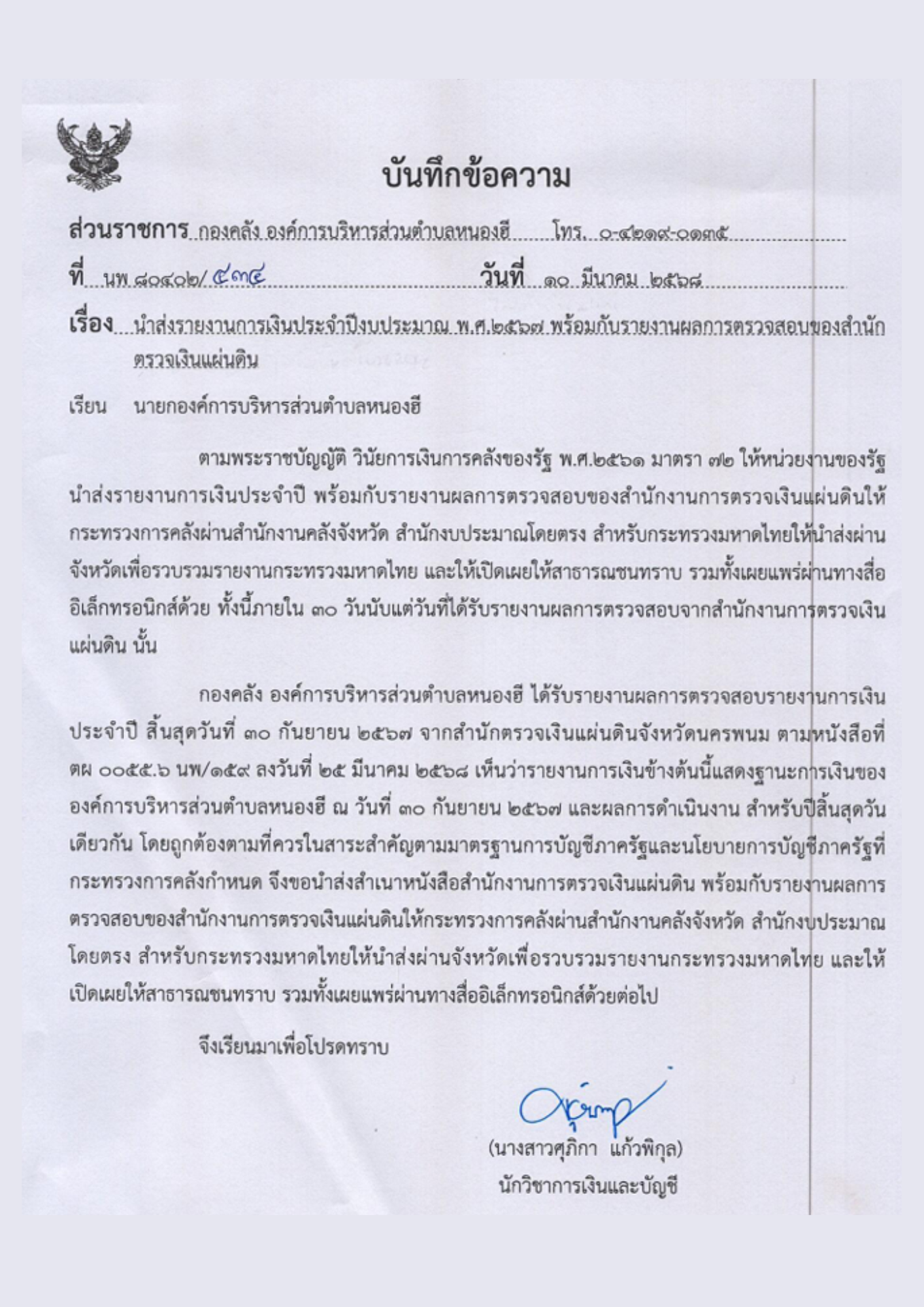 นำส่งรายงานการเงินประจำปีงบประมาณ พ.ศ. 2567 พร้อมกับรายงานผลการตรวจสอบของสำนักตรวจเงินแผ่นดิน