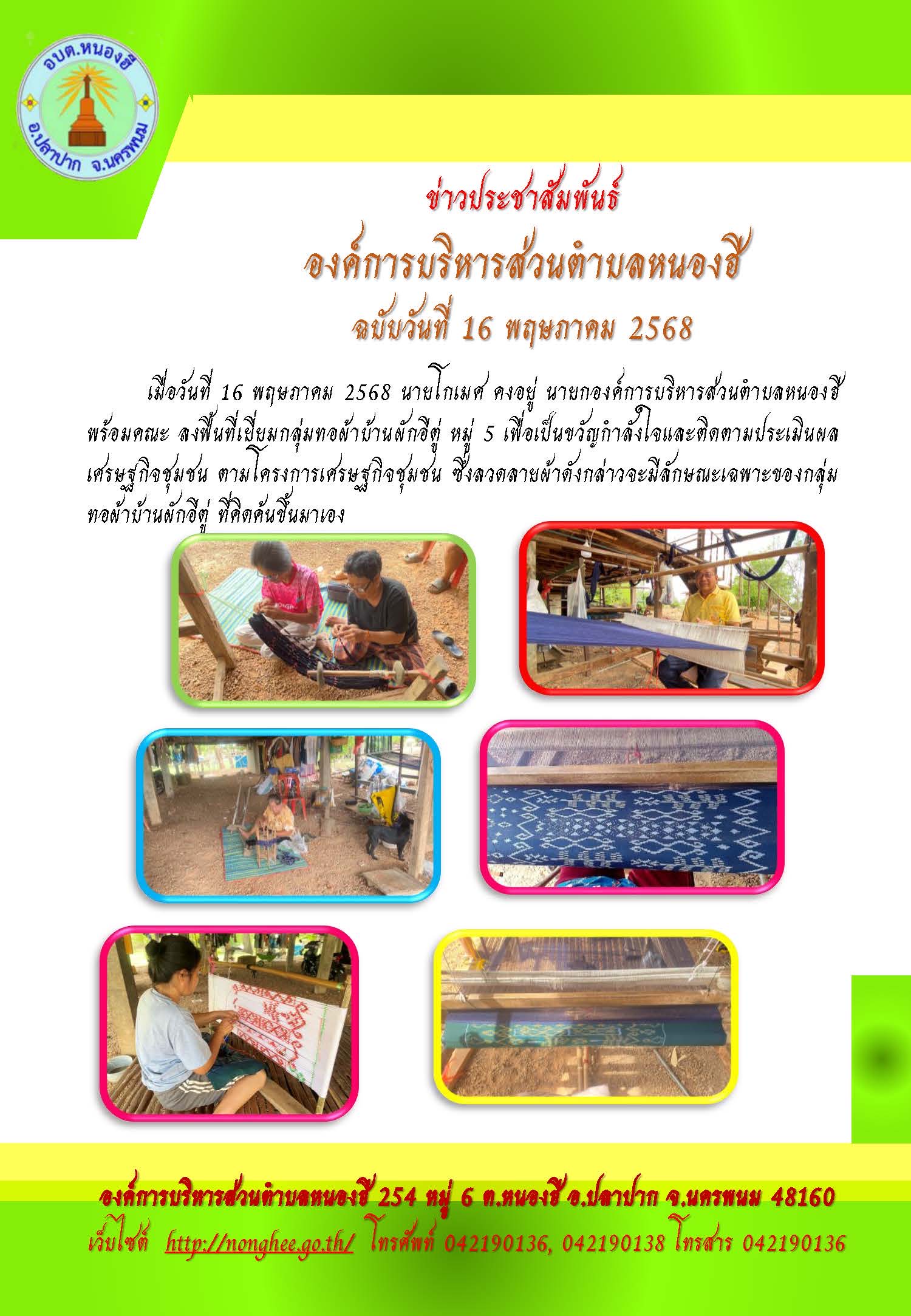 เมื่อวันที่ 16 พฤษภาคม 2568 นายโกเมศ คงอยู่ นายกองค์การบริหารส่วนตำบลหนองฮี พร้อมคณะ ลงพื้นที่เยี่ยมกลุ่มทอผ้าบ้านผักอีตู่ หมู่ 5 เพื่อเป็นขวัญกำลังใจและติดตามประเมินผลเศรษฐกิจชุมชน ตามโครงการเศรษฐกิจชุมชน